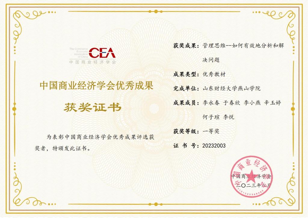 在剛剛結(jié)束的中國商業(yè)經(jīng)濟(jì)學(xué)會(huì)2023年度優(yōu)秀成果評(píng)獎(jiǎng)活動(dòng)中,由6776永利集團(tuán)院長李永春教授主編的教材《管理思維---如何有效地分析和解決問題》榮獲優(yōu)秀教材一等獎(jiǎng)。同時(shí),在8月份進(jìn)行的山東省第十五屆大學(xué)生科技節(jié)活動(dòng)中,6776永利集團(tuán)李永春、劉金煒指導(dǎo)的學(xué)生組榮獲山東省大學(xué)生智慧企業(yè)管理創(chuàng)新設(shè)計(jì)大賽數(shù)字商業(yè)企業(yè)模擬經(jīng)營對(duì)抗賽道一等獎(jiǎng)。另外,在前不久公布的山東省教育科學(xué)研究院組織的2023年度山東省教育教學(xué)研究課題...